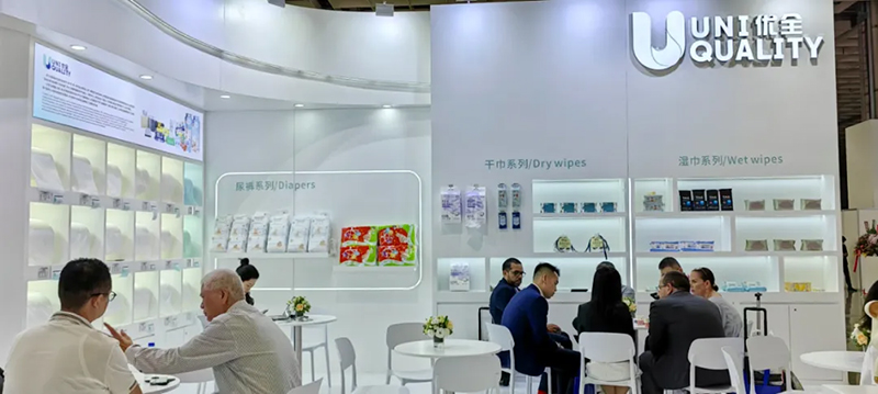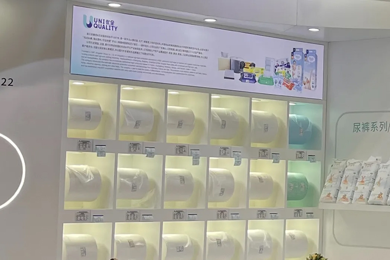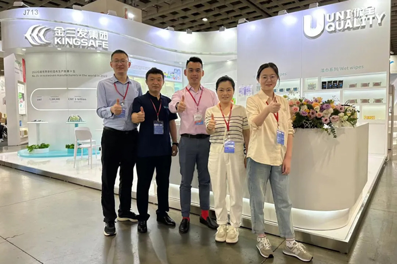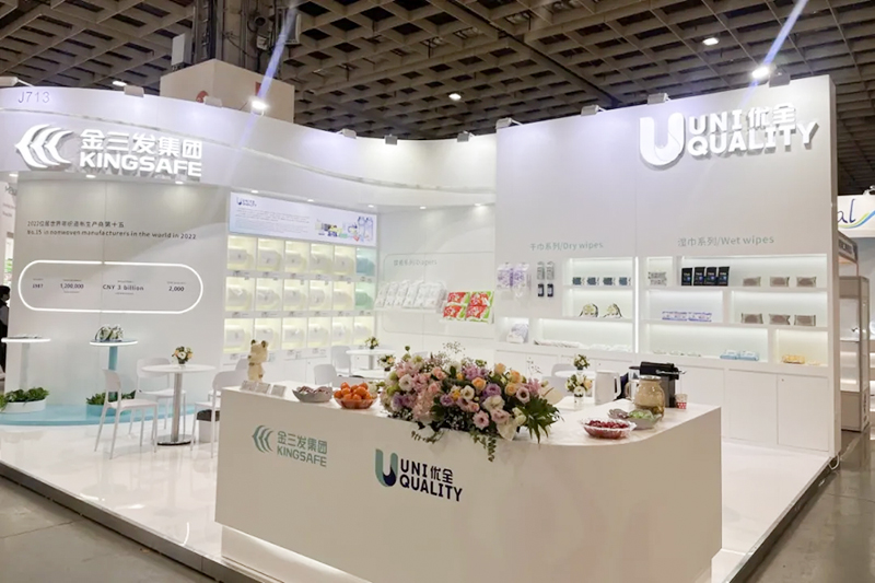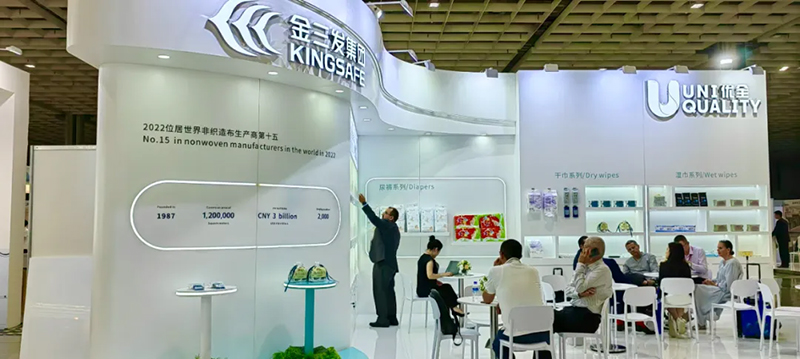 Zu den von Kingsafe Group und Youquan Care ausgestellten Produkten gehören Feuchttücher, Baumwolltücher, Windeln, abspülbares Nasstoilettenpapier, Spunlace-Vliesstoffe, Spunmelt-Vliesstoffe und Heißluft-Vliesstoffe sowie andere vielfältige Produkte.