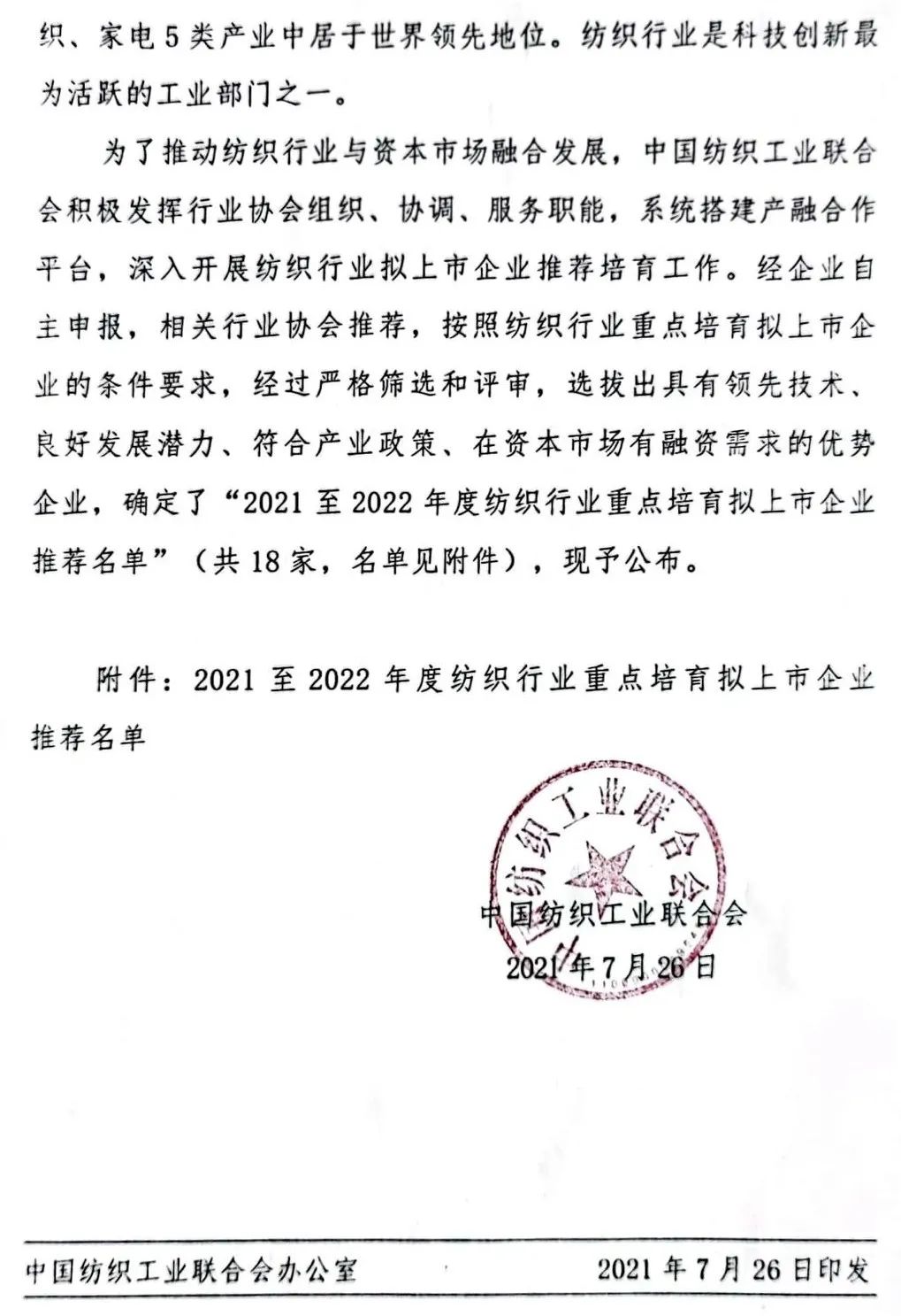 Im ersten Jahr des 14. Fünfjahresplans beschleunigt die China Textile Industry Federation die Integration der Textilindustrie und des Kapitalmarkts. Am 26. Juli veröffentlichte der China Textile Industry Federation die Bekanntmachung über die Veröffentlichung der empfohlenen Liste der wichtigsten Unternehmen, die in der Textilindustrie von 2021 bis 2022 aufgeführt werden sollen. Nach einer strengen Prüfung und Bewertung wurden 18 vorteilhafte Unternehmen mit führender Technologie und gutem Entwicklungspotenzial ausgewählt mit der Industriepolitik und dem Finanzierungsbedarf am Kapitalmarkt wurden für die Bildung einer Empfehlungsliste ausgewählt. Diese Unternehmen umfassen neue Fasermaterialien, intelligente Fertigung, Modekonstruktion, umweltfreundliche Fertigung, hochwertige Industrietextilien und andere Bereiche, die auch die Schlüsselbereiche sind, die durch den textilen „14. Fünfjahresplan“ unterstützt werden.